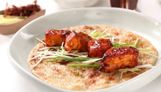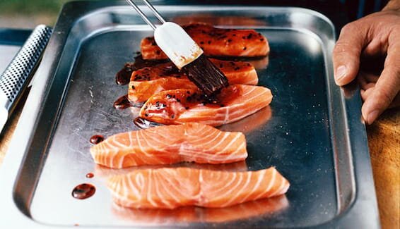 將三文魚輕放入平底鍋,撒有胡椒的一面向下。