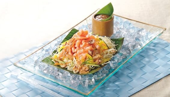 鋪上各式蔬菜、放上煎好的三文魚,拌上胡椒沙律醬、搭配對半切開的車厘茄、紅色薄洋蔥圈和百吉圈麵包粒食用。