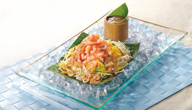 碟內先放冷麵,排上一層配菜絲,挪威三文魚放最上面,淋上冷麵醬汁及灑些乾蔥片增添口感。