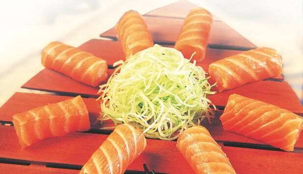 將三文魚薄片包卷釀皮絲成卷。