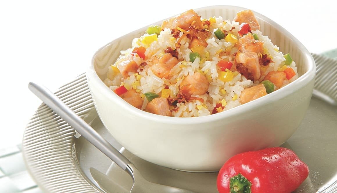 再燒2湯匙油,爆香薑末,加白飯炒,淋下適量鹽及XO醬,最後加三文魚粒及三色椒一起炒勻,取出上一碟。
